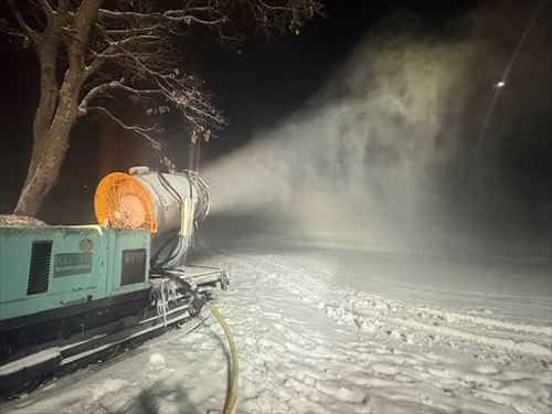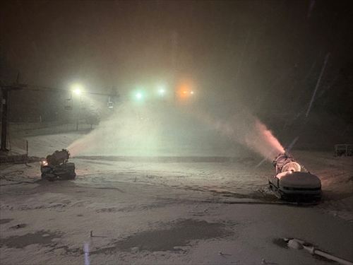 人工降雪機も外気温がマイナス2℃以下にならないと雪がつくれません。14日(日)現在、第1リフトのコースの約60%に雪を付ける事が出来ています。グランドオープンを予定している19日(金)までは何としても滑走可能にすべく最大限の努力をしてまいる所存です。もうしばらくお待ちください。」