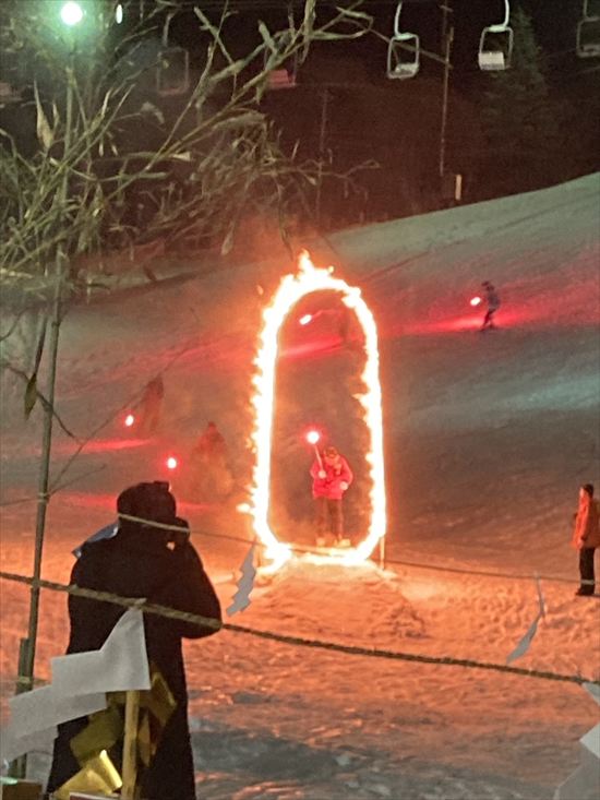 初すべりセレモニーでは、猿倉名物の「たいまつ滑走&火の輪くぐり」をご披露しました」